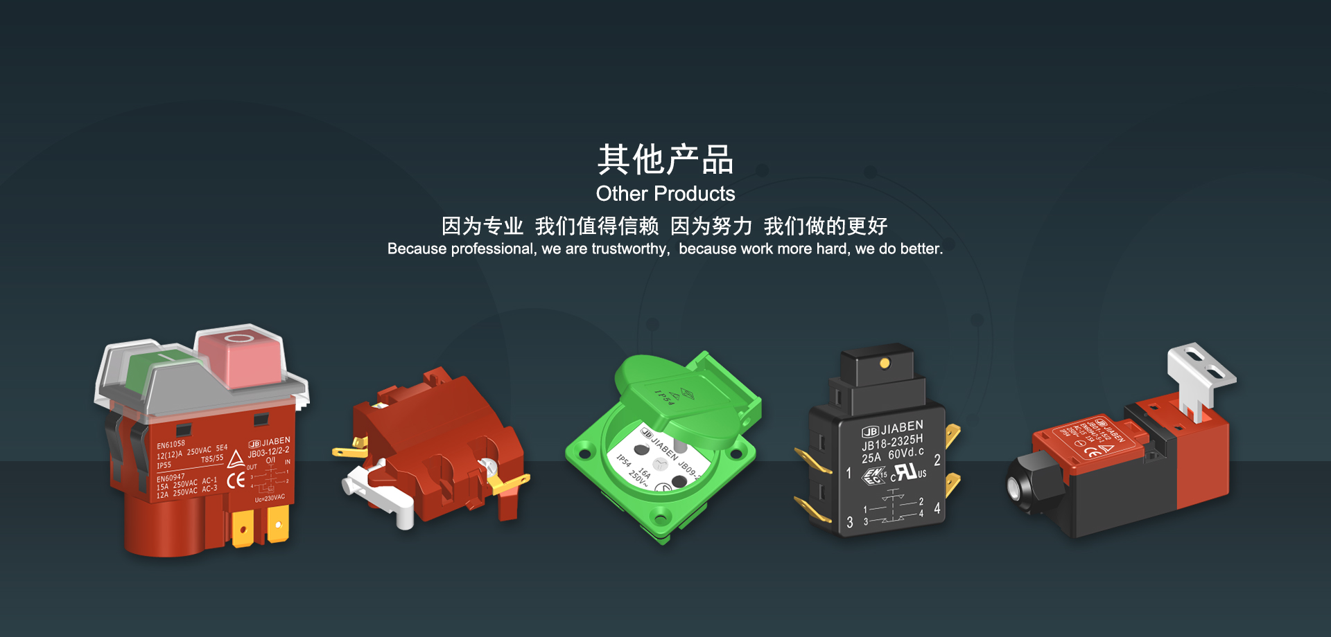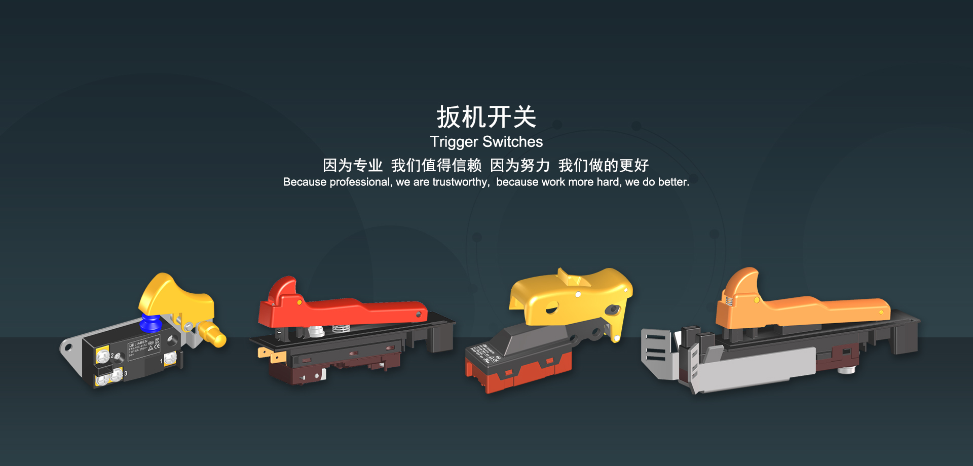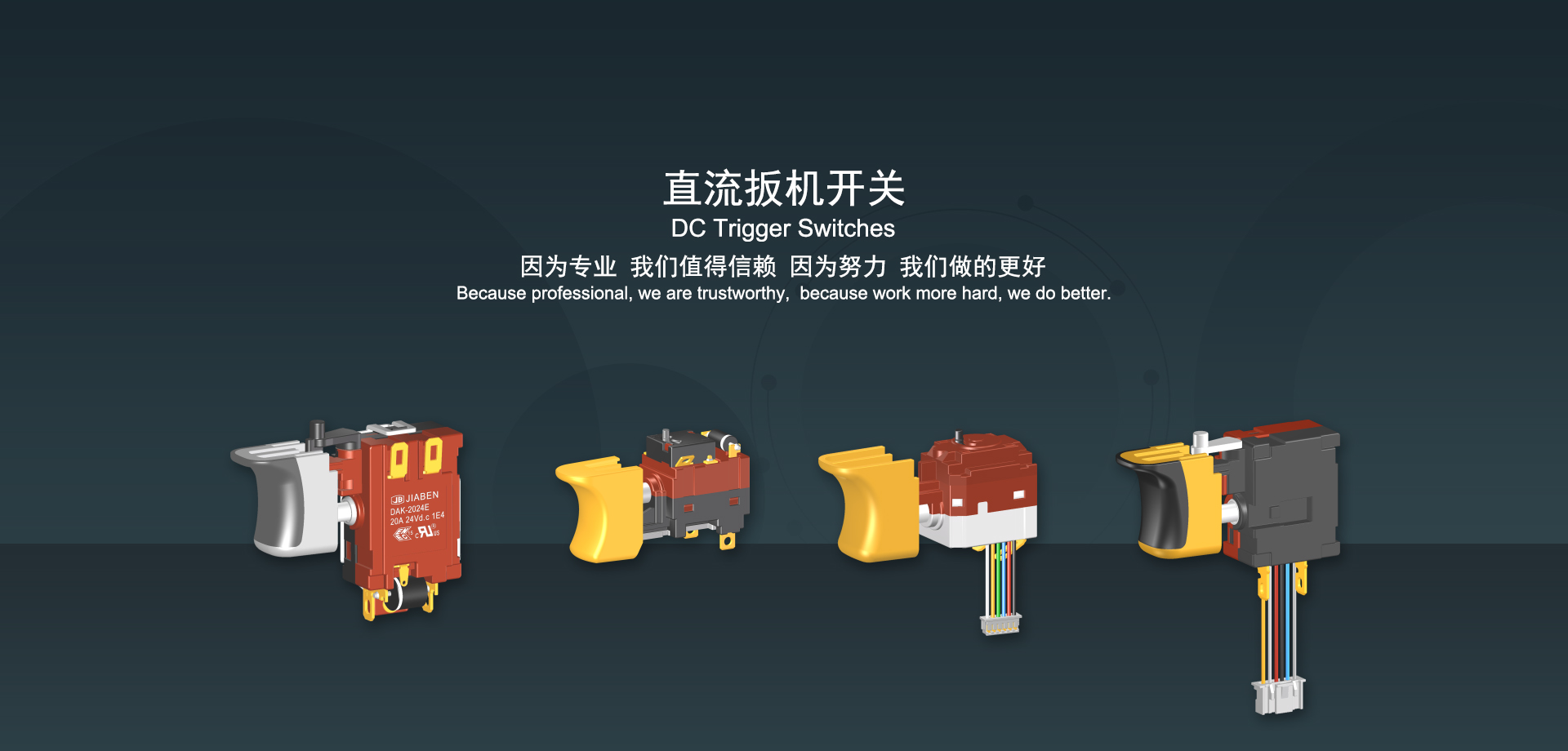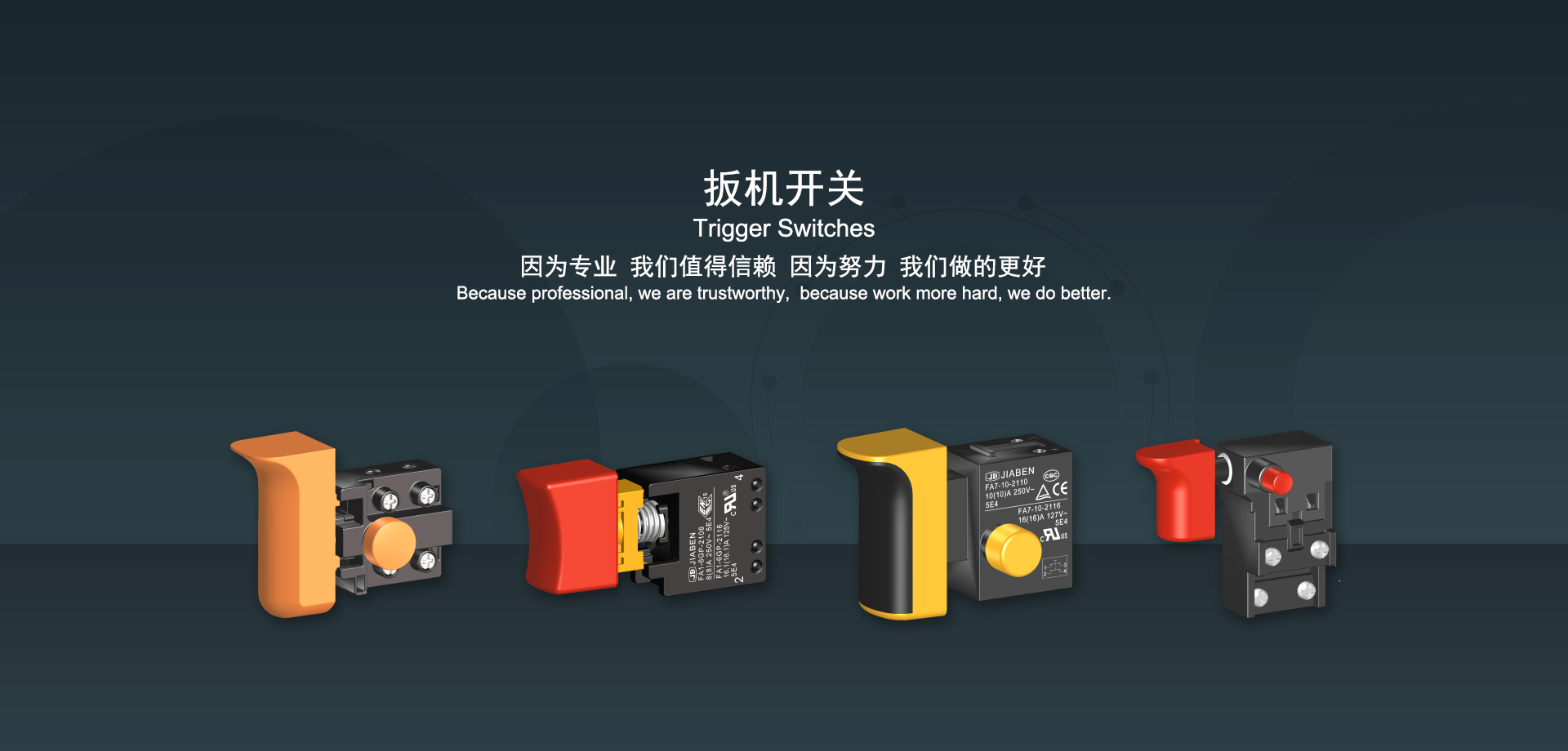 浙江佳奔電子有限公司始建于1986年,坐落于浙江省樂清市虹橋鎮(zhèn)東電子信息產(chǎn)業(yè)園內,現(xiàn)有職工700多人,資產(chǎn)總額超3億元。公司主要經(jīng)營“JIABEN”牌微動開關、蹺板開關、按鈕開關、扳機開關、調速開關和電位器開關等各類交、直流器具開關和各類交、直流線路板模塊等產(chǎn)品,主要應用于交、直流電動工具、電動園林工具、清潔器具、家用電器和小型機床等行業(yè),是集產(chǎn)品設計、研發(fā)、制造、銷售和服務于一體的國家高新技術企業(yè)。JIABEN was founded in 1986, located in East Electronic Information Industry Park, Hongqiao Town, Yueqing City, Zhejiang Proviance, existing staff more than 700 peoples, more than 300 million RMB worth of assets. Company is mainly engaged in "JIABEN" brand Micro Switch, Rocker Switch, Push-button Switch, Trigger Switch, Speed Regulating Switch, Potentiometer Switch and other kinds of appliance switch and all kinds of AC or DC circuit board module, such as more than 100 series, 8000 kinds of models of products, mainly used in AC or DC Power-tools, Power Gardening Tools, Cleaning Appliances, Household Appliances and Small Machine Tool and other industries, is the collection product design, research and development, manufacturing, sales and service in one of the national high and new technology enterprise.